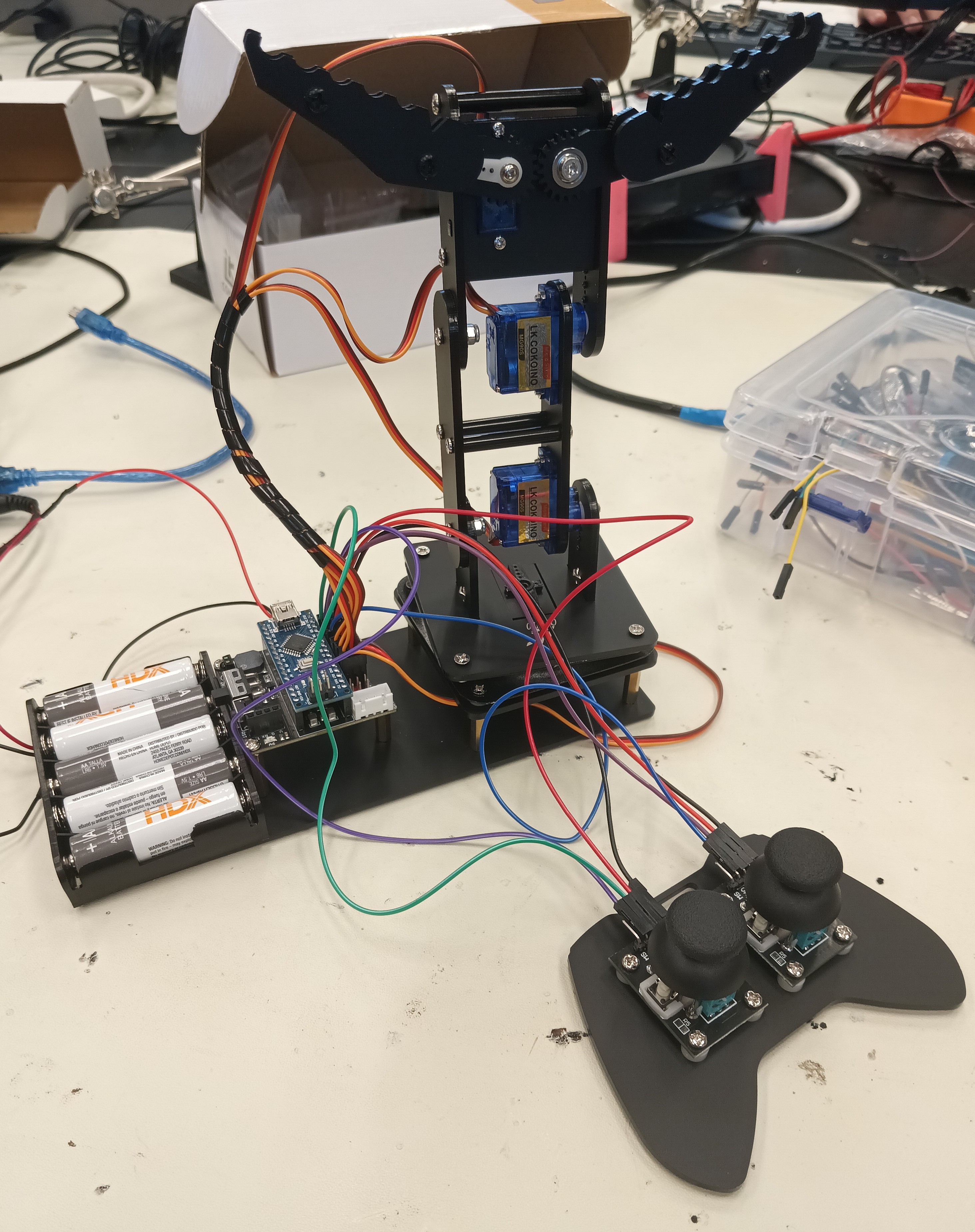 For the second milestone, I had to cut the ground and voltage wires of the battery port of the claw and solder them to a new battery case as lithium batteries are not allowed in Bluestamp projects. Before beginning assembly, I used the Arduino program, Servo_90_ADJ.ino, provided by the pdf claw tutorial to adjust the servos to all be 90°, using a USB to connect the Arduino Nano to my computer. I then assembled the stand for the Arduino Nano and shield using standoffs and did the same for the ball-bearing base of the claw arm. Next, I added the servo for the base of the claw arm and attached a rectangular piece to it that would allow the servo to rotate the entire base. I then screwed together the claw arm with two servos, making sure that they were straight. Finally, I screwed in the servo for the claw and attached the claw half to it and lined up the other half with the first. I then assembled a simple controller using one of the acrylic plates and screwing in two joysticks. I then did the necessary wiring for the claw to properly work and be controllled by the claw. I uploaded the Arduino program, Arm.ino, provided by the tutorial to the Arduino Nano, allowing me to control the claw with the joysticks.Challenges Faced