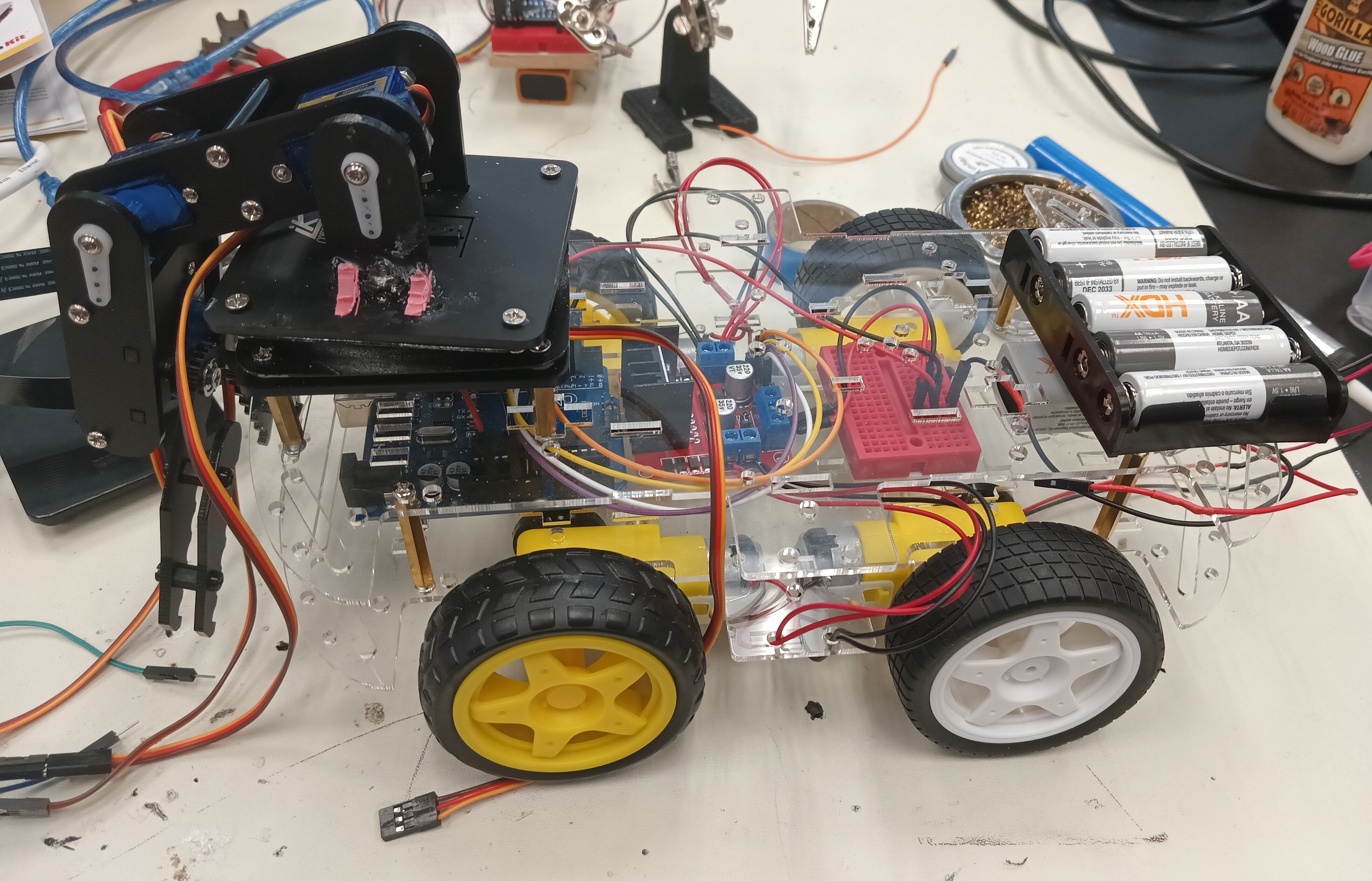 For the third milestone, I cut out a small rectangular board with a saw and drilled holes into it to act as the base for my remote. I then screwed the joystick module on the board and using the breadboard adhesive, mounted the small breadboard with the Arduino Nano on the board as well. I then made the necessary connection for the remote to work using the jumper cables and also attached the battery to the back of the board using velcro. Finally, I finished the remote by taping the wireless module to the middle of the board. I also setup the necessary connections on the Arduino Uno of the car to make sure that the wireless module was working properly. I coded the remote and the car and was successfully able to control the car wirelessly with little latency. However, I later realized that the car chassis I had from milestone 1 was not large enough to fit all of the necessary hardware for the robot so I asked my instructors for a bigger car chassis to replace it. I assembled the new chassis with four new motors mand mounted the Arduino Uno, a new motor driver, a small breadboard for ground and power connections, and a 9V battery to it. I then reprogrammed the Arduino Uno to controll four wheels instead of two. Finally, I mounted the claw on top of the car using screws and tested the car to see how well it could move with the heavy claw. It worked very well and was able to move effortlessly.Challenges Faced